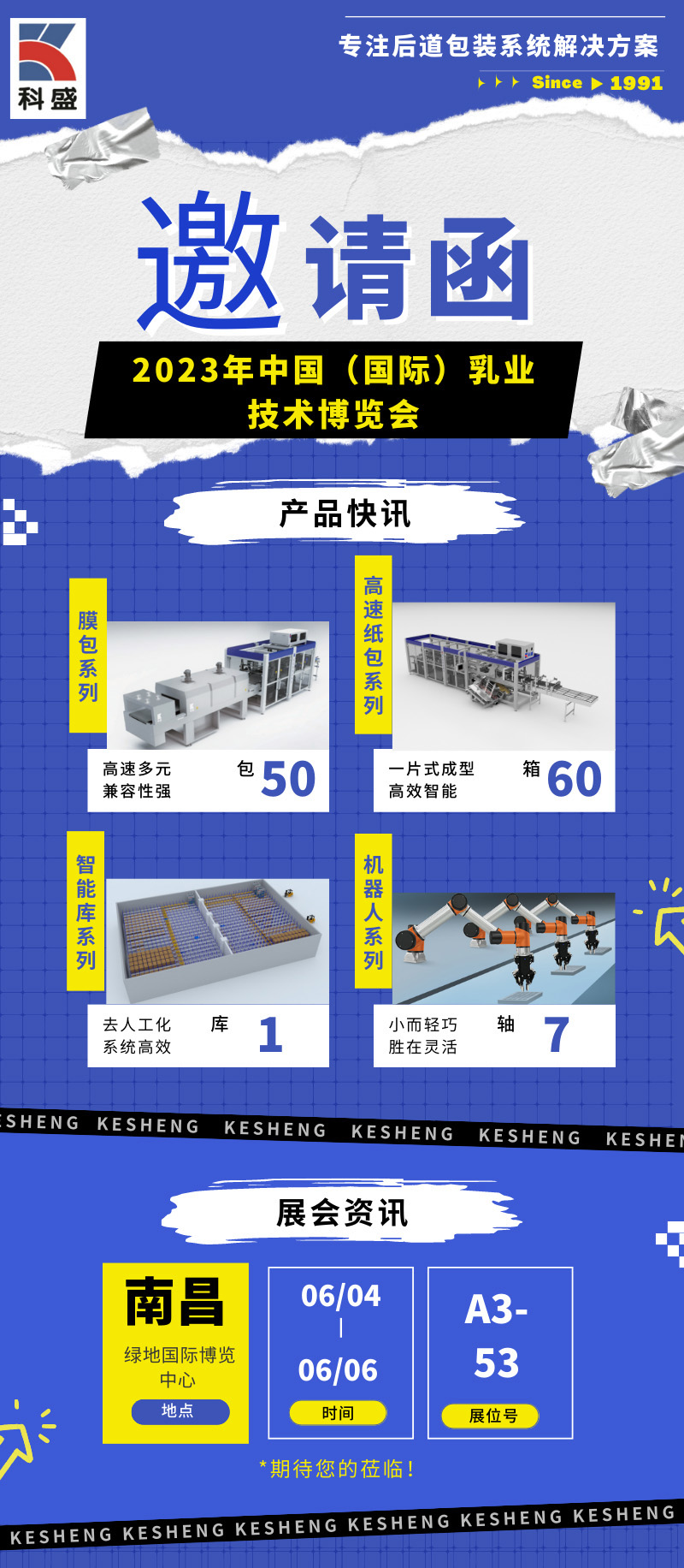 Dingdong~Kesheng Company is about to meet everyone at the 2023 China (International) Dairy Technology Expo! Kesheng is committed to automated logistics packaging equipment, with products covering the full automatic heat shrink packaging machine series, full automatic cardboard packaging machine series, robot stacking series, and more, providing you with a one-stop back-end packaging solution. At this grand event, Kesheng will make a grand appearance with multiple products, explaining the product features on-site, hoping to generate more conceptual collisions with everyone offline, and I believe it will bring more surprises to everyone!